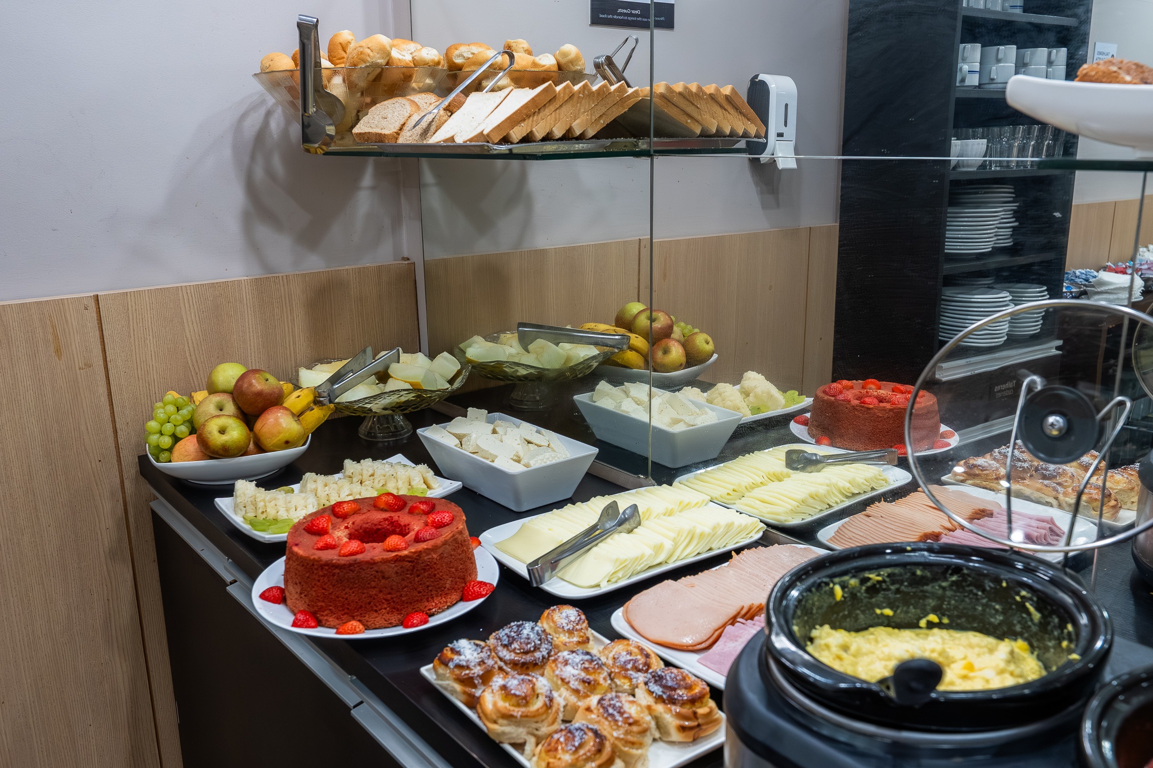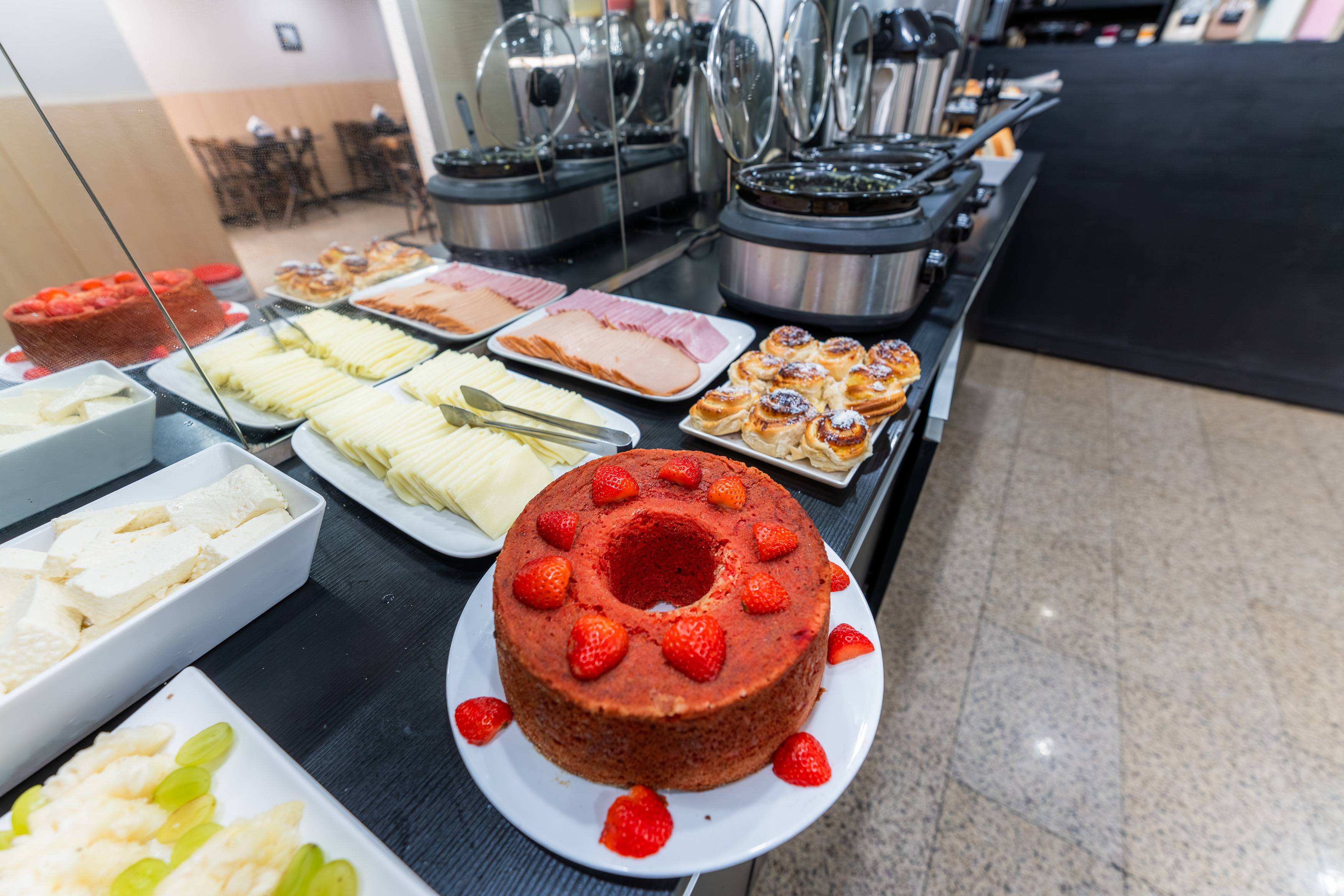 O café da manhã cortesia é um buffet com grande variedade de pães, bolos, frutas da estação, salgados, bebidas quentes, sucos e diversos itens.