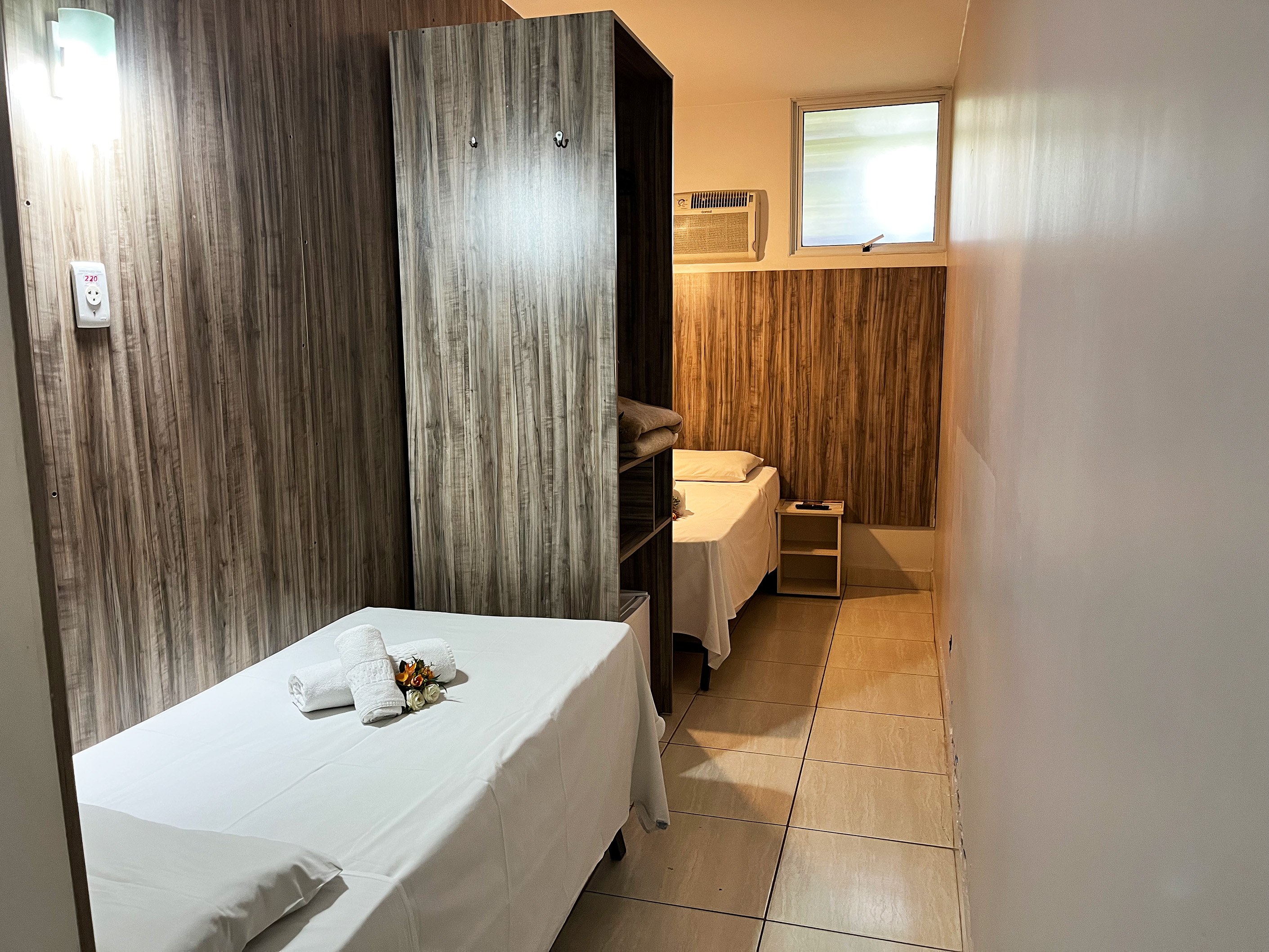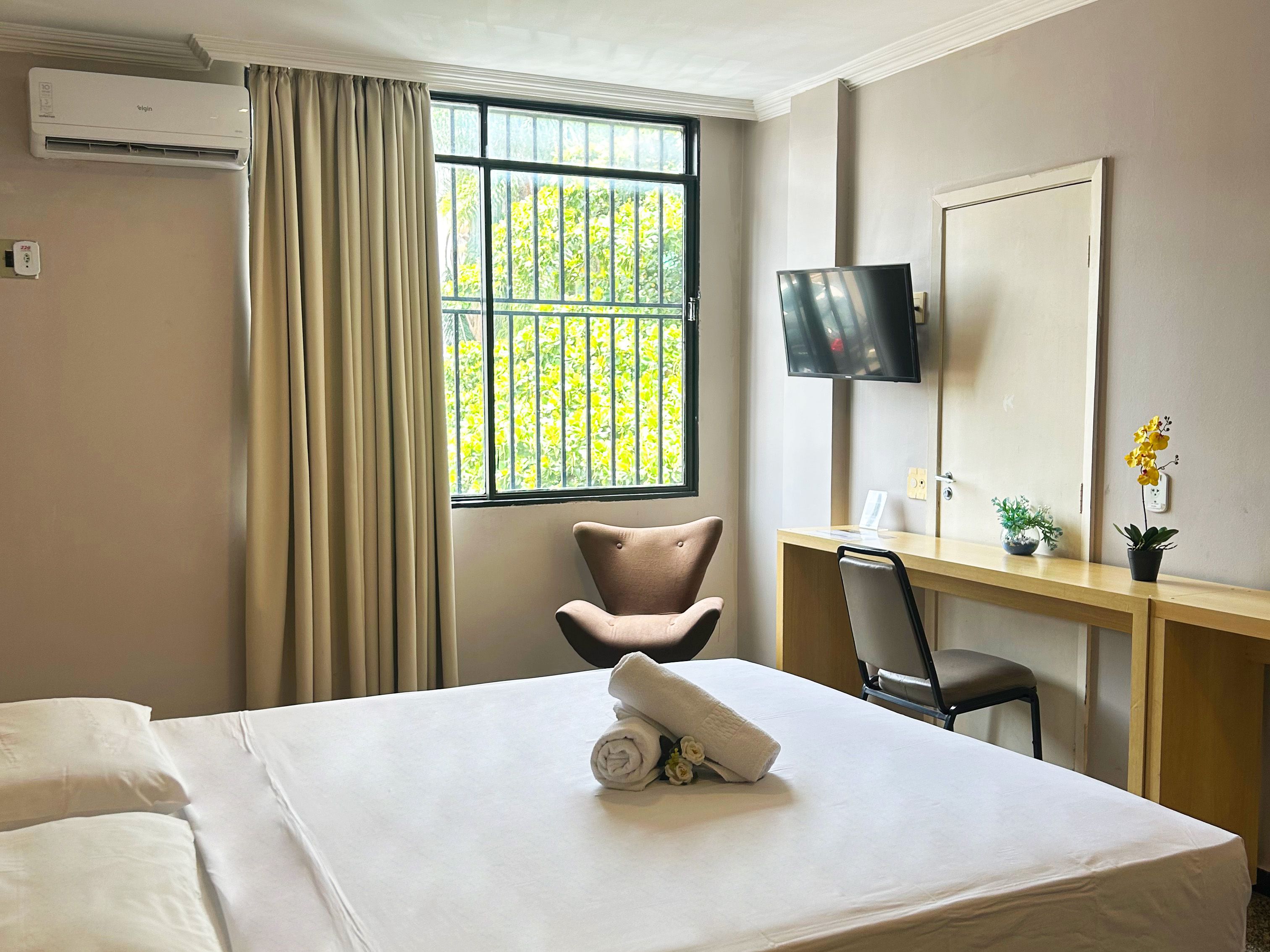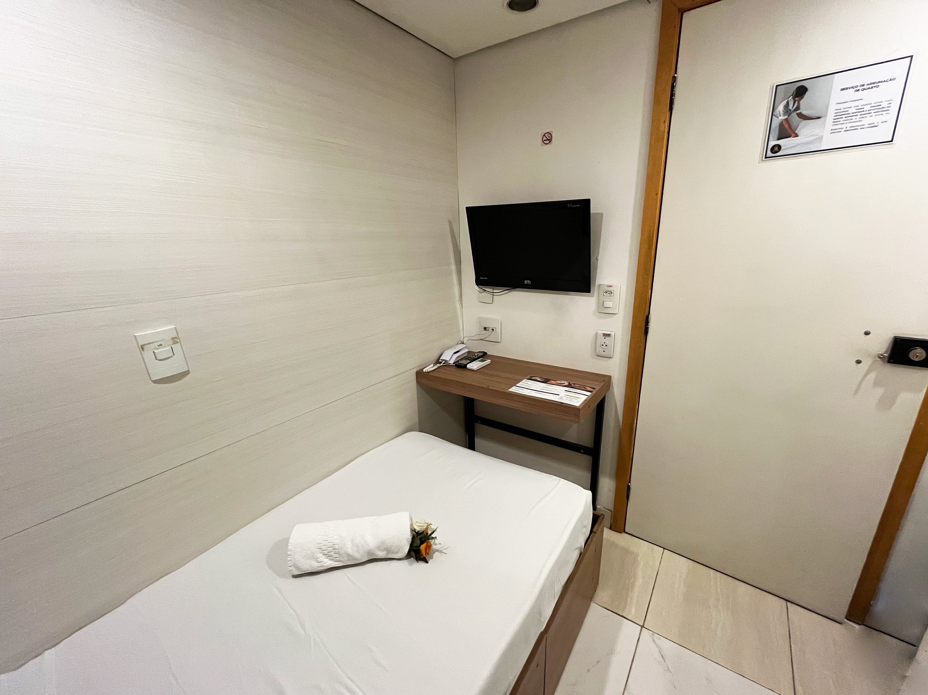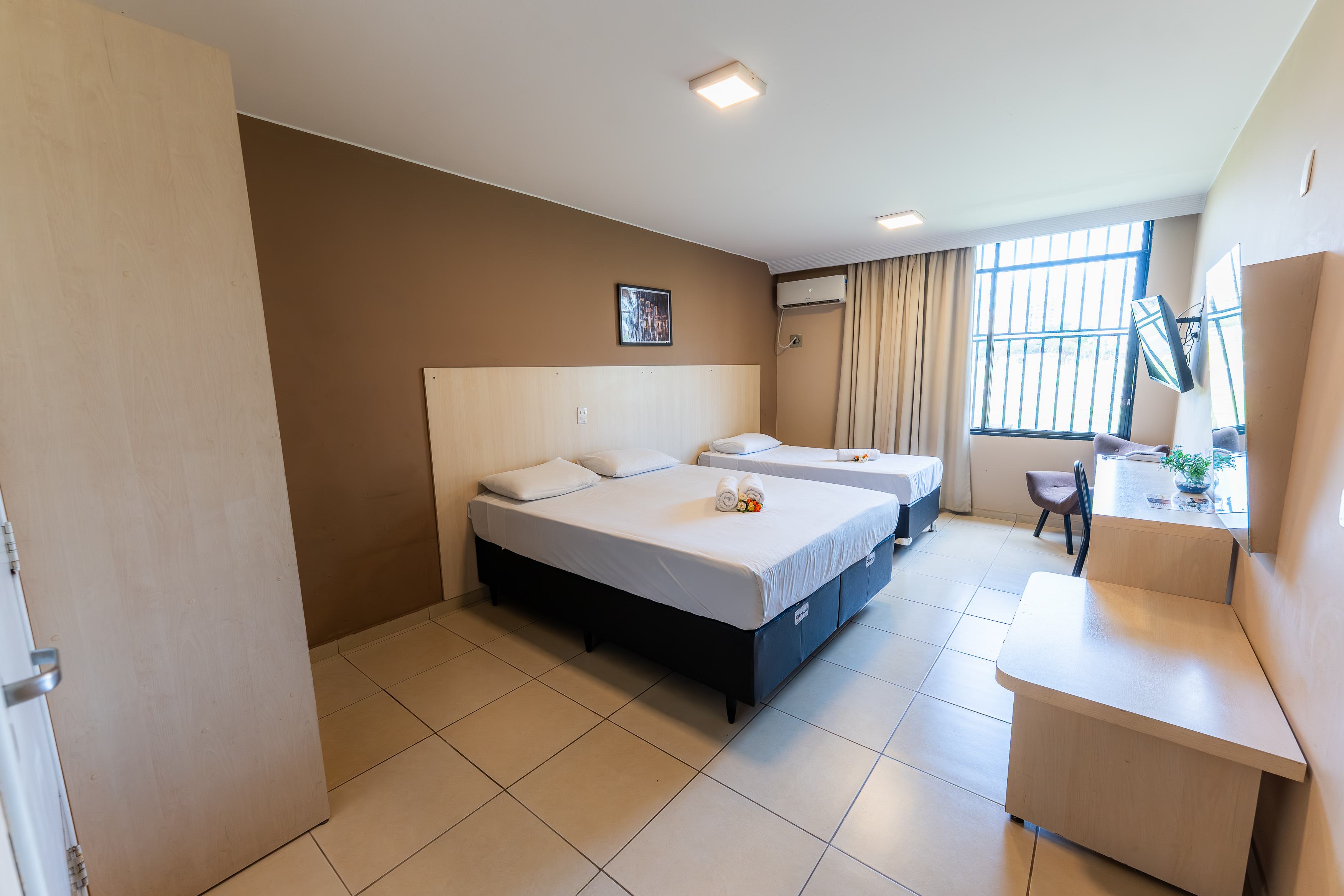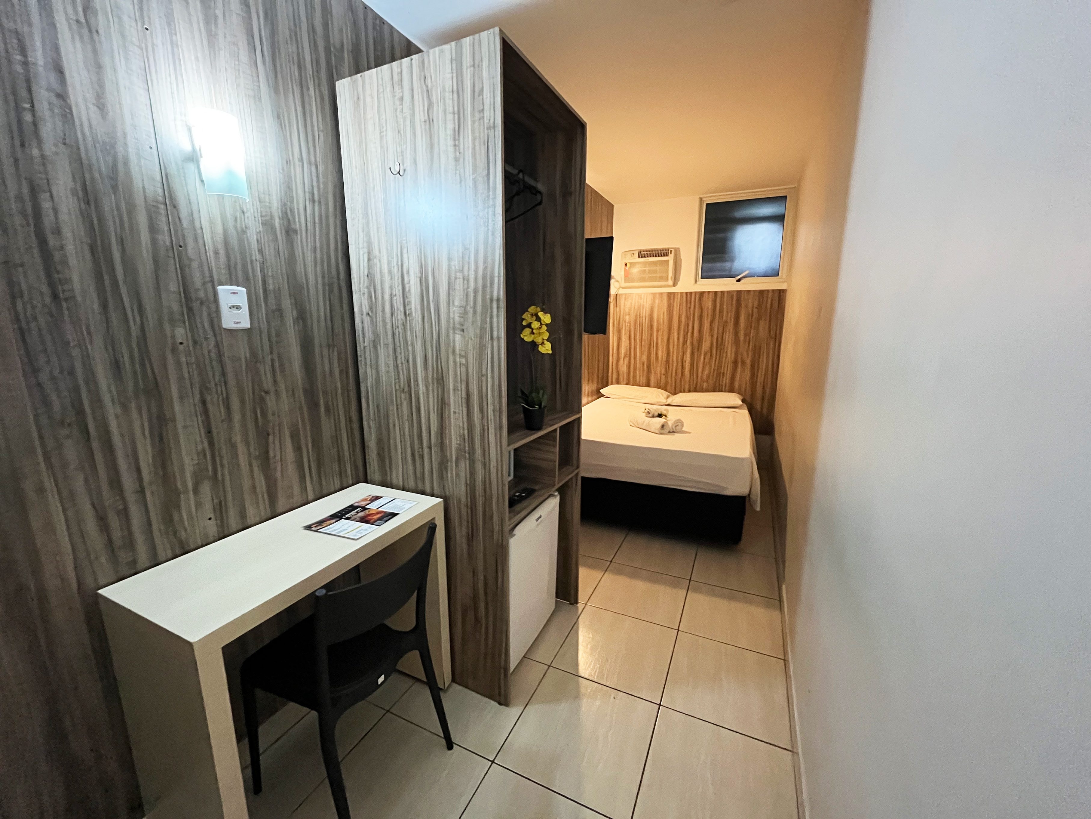 Com aproximadamente 2,40m x 2,50m, é um quarto compacto, ideal para hóspedes que valorizam praticidade, silêncio e eficiência, e não precisam de grandes espaços para circulação.