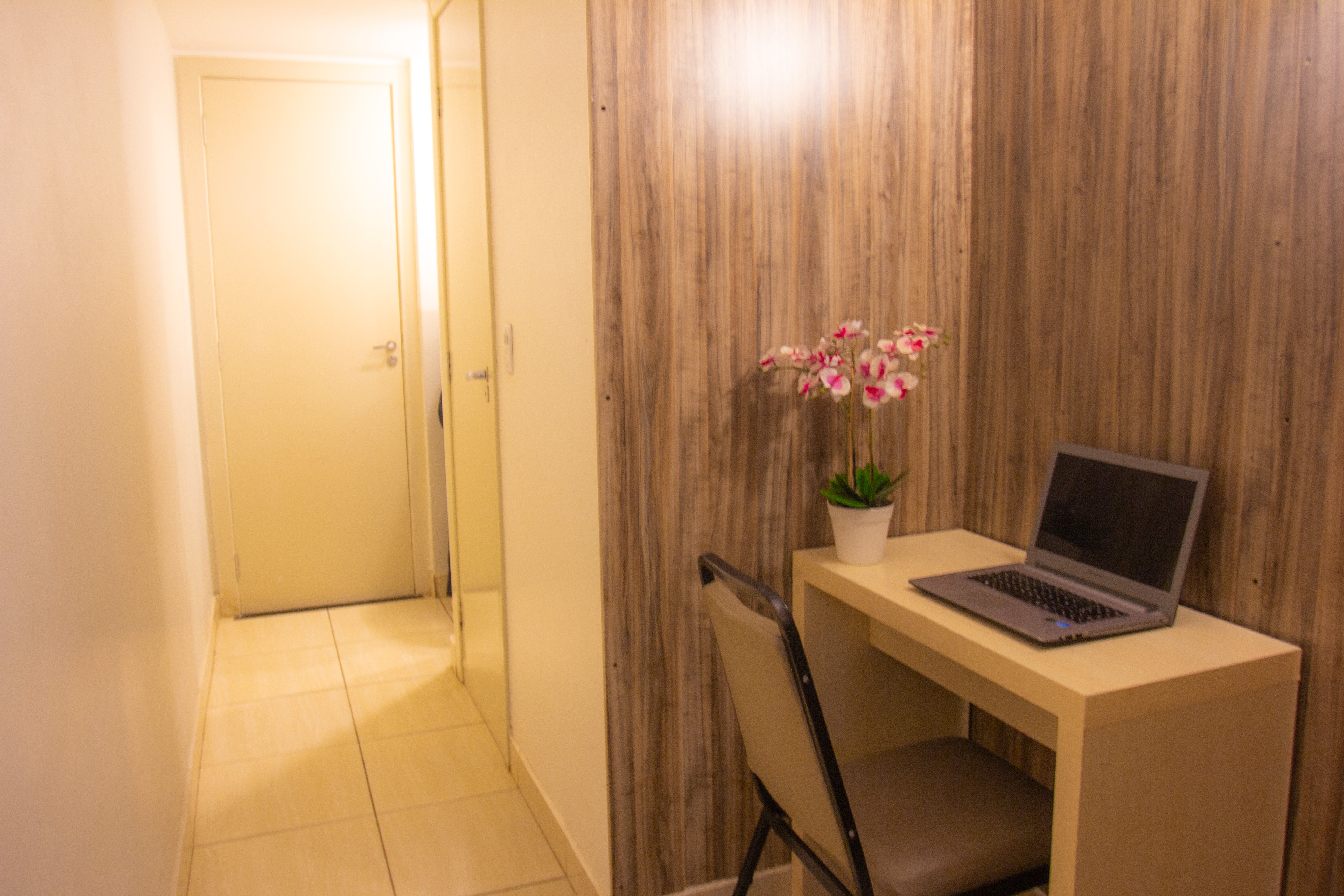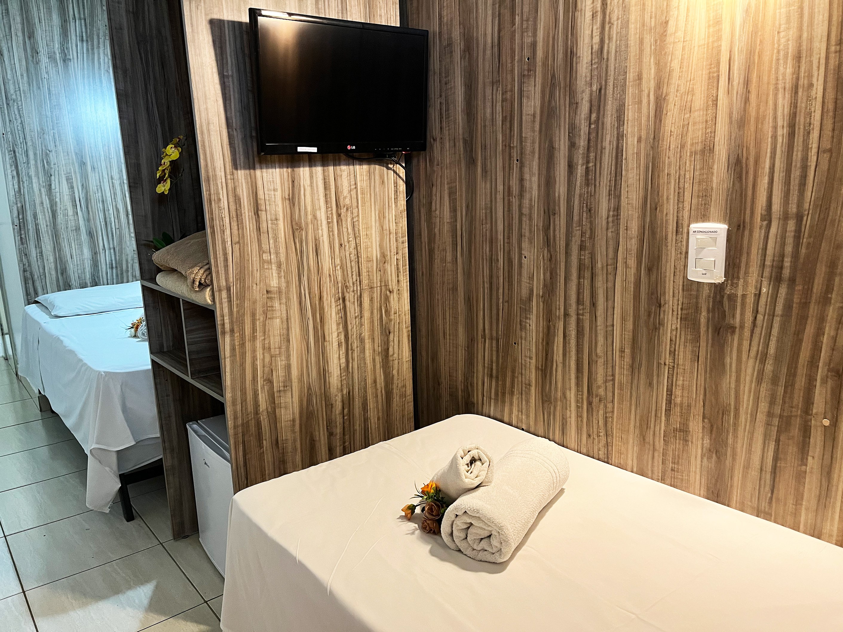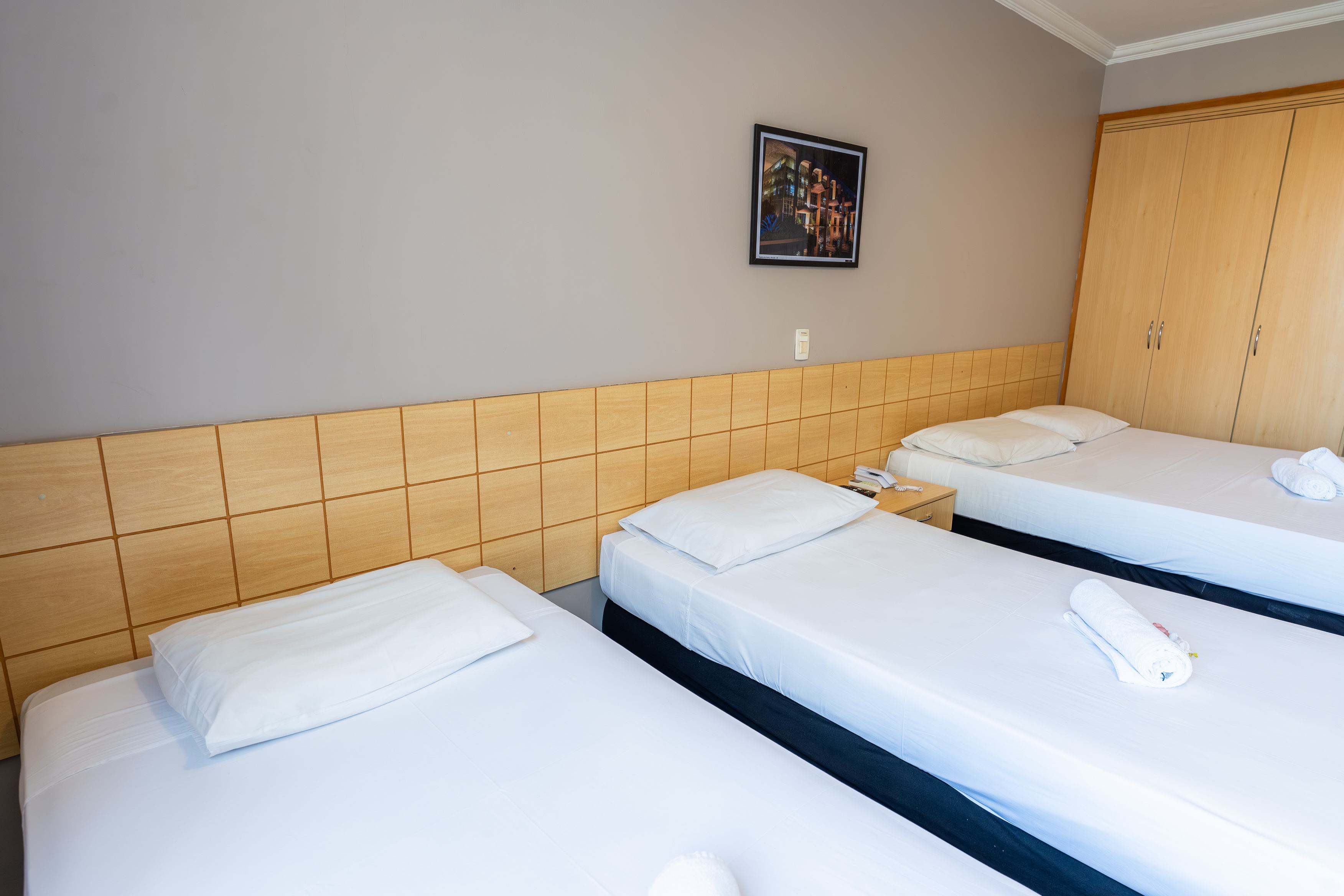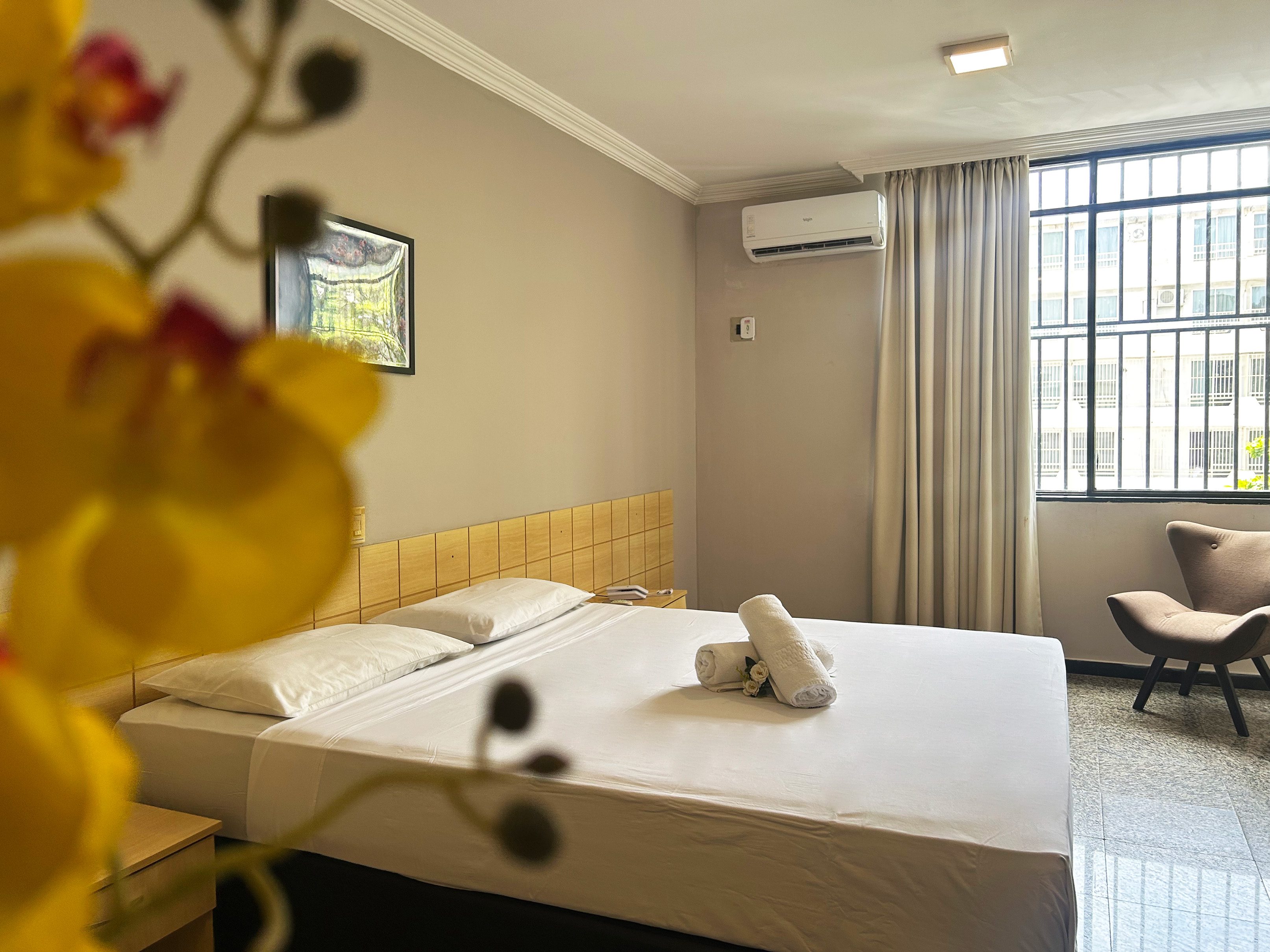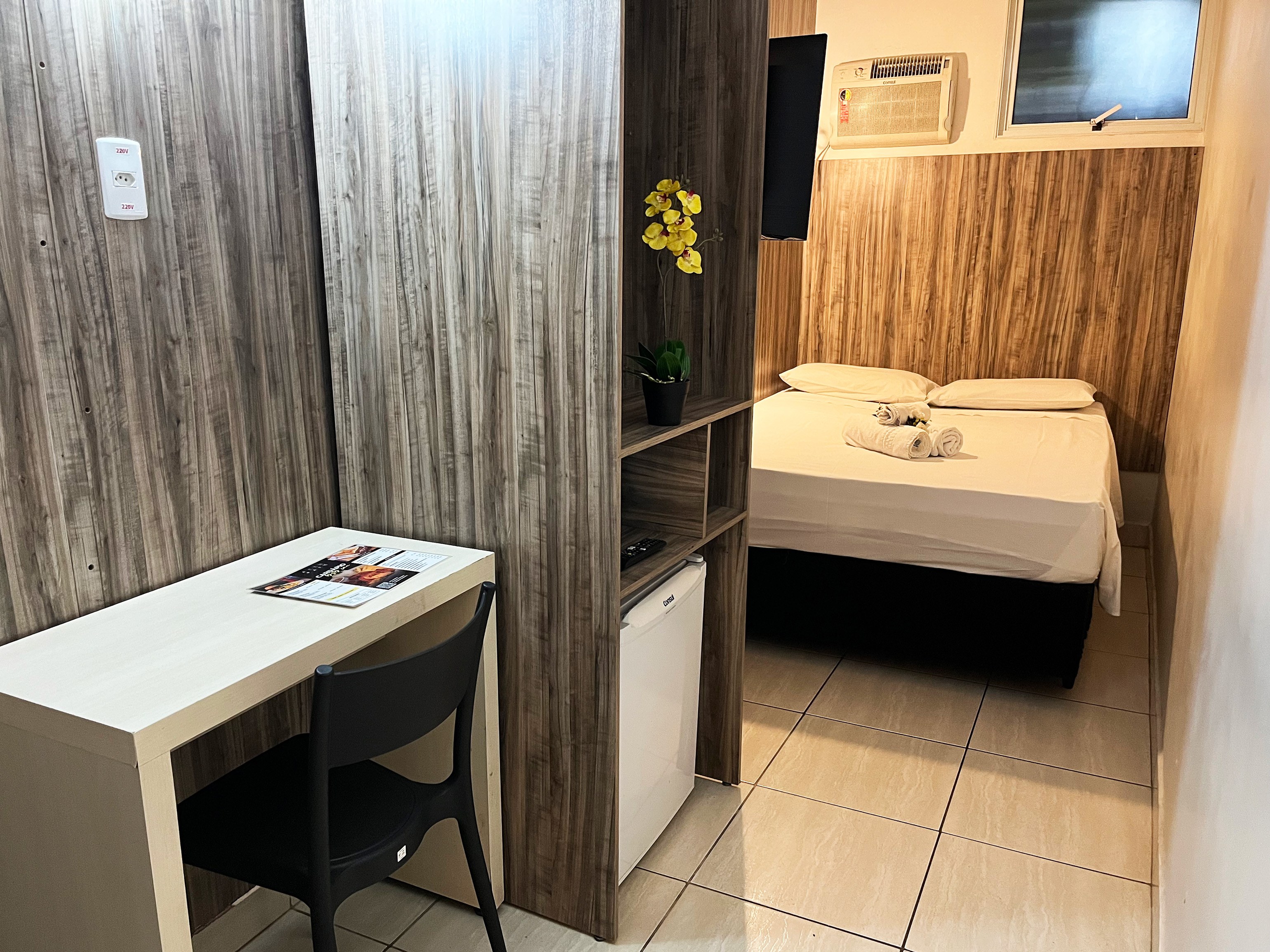 Com aproximadamente 2,40m x 2,50m, é um quarto compacto, ideal para hóspedes que valorizam praticidade, silêncio e eficiência, e não precisam de grandes espaços para circulação.